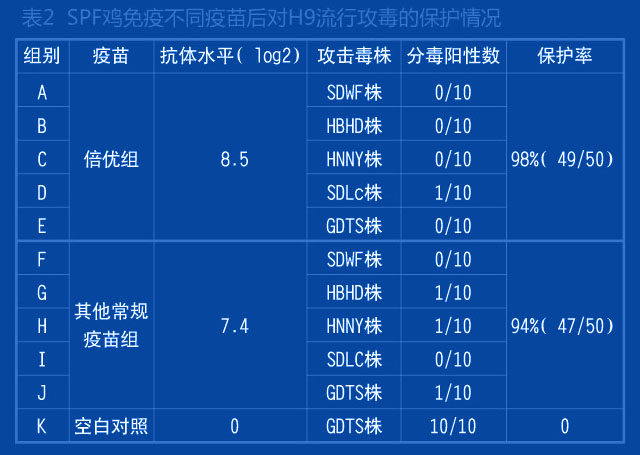 在實驗室條件下,SPF雞7日齡一次免疫倍優(yōu)TM系列產(chǎn)品(ND+H9 ) 0.1ml,免疫后21天采用各地分離的流行H9毒株行攻毒,倍優(yōu)組的攻毒保 護為98% (表2)。