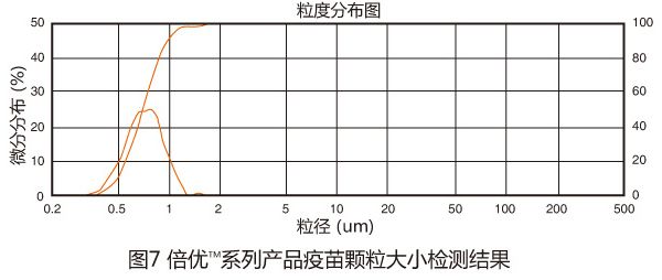 倍優(yōu)?系列產(chǎn)品每一個疫苗毒株均單獨接種雞胚,分別采毒后經(jīng)超高超微分離濃縮后再純化,高度去除雞胚尿棄液中的尿酸鹽、脂多糖等雜質(zhì),經(jīng)過高度純化和超高濃縮后,在進行抗體復(fù)配,確??乖煞謫我?,從而保證乳化后的疫苗顆粒大小適中、均勻,有效刺激機體產(chǎn)生高而待久的抗體水平;倍優(yōu)?系列產(chǎn)品疫苗顆粒大小0.5~0.6μm ,該大小顆粒占95%以上(圖7)。