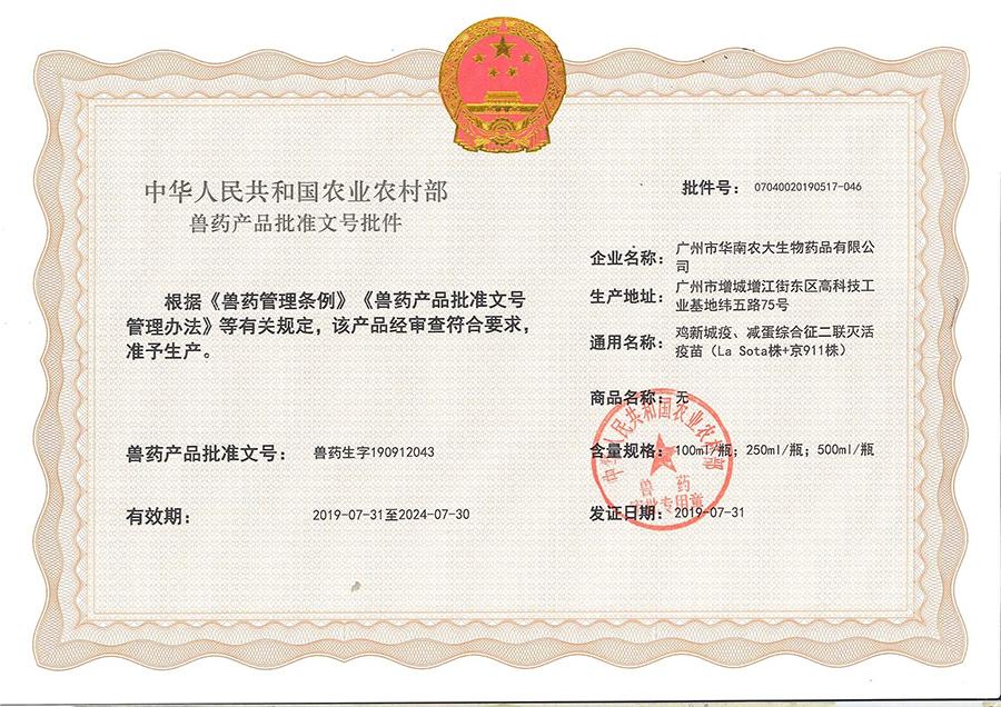 獸藥生產(chǎn)許可證:(2022)獸藥生產(chǎn)證字19091字